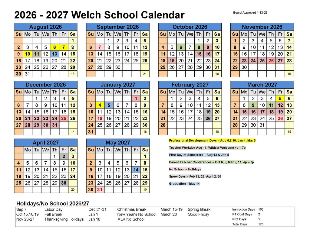 Welch Public School's SY26-27 Board Approved school year calendar.